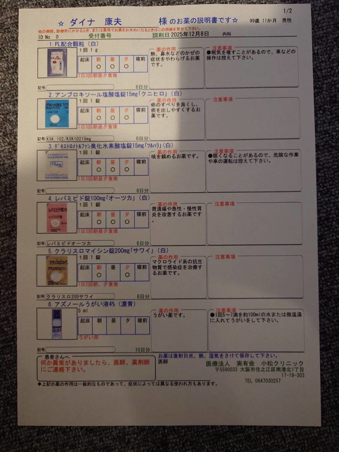 薬と一緒にお渡ししている薬剤情報書(通称:薬情)のソフトウェアを最新のものに更新しました。内服の際は薬情をよく読んでいただいたうえで用法、用量を守って飲んでください。見方がわからない場合は当院スタッフにお伝えください。