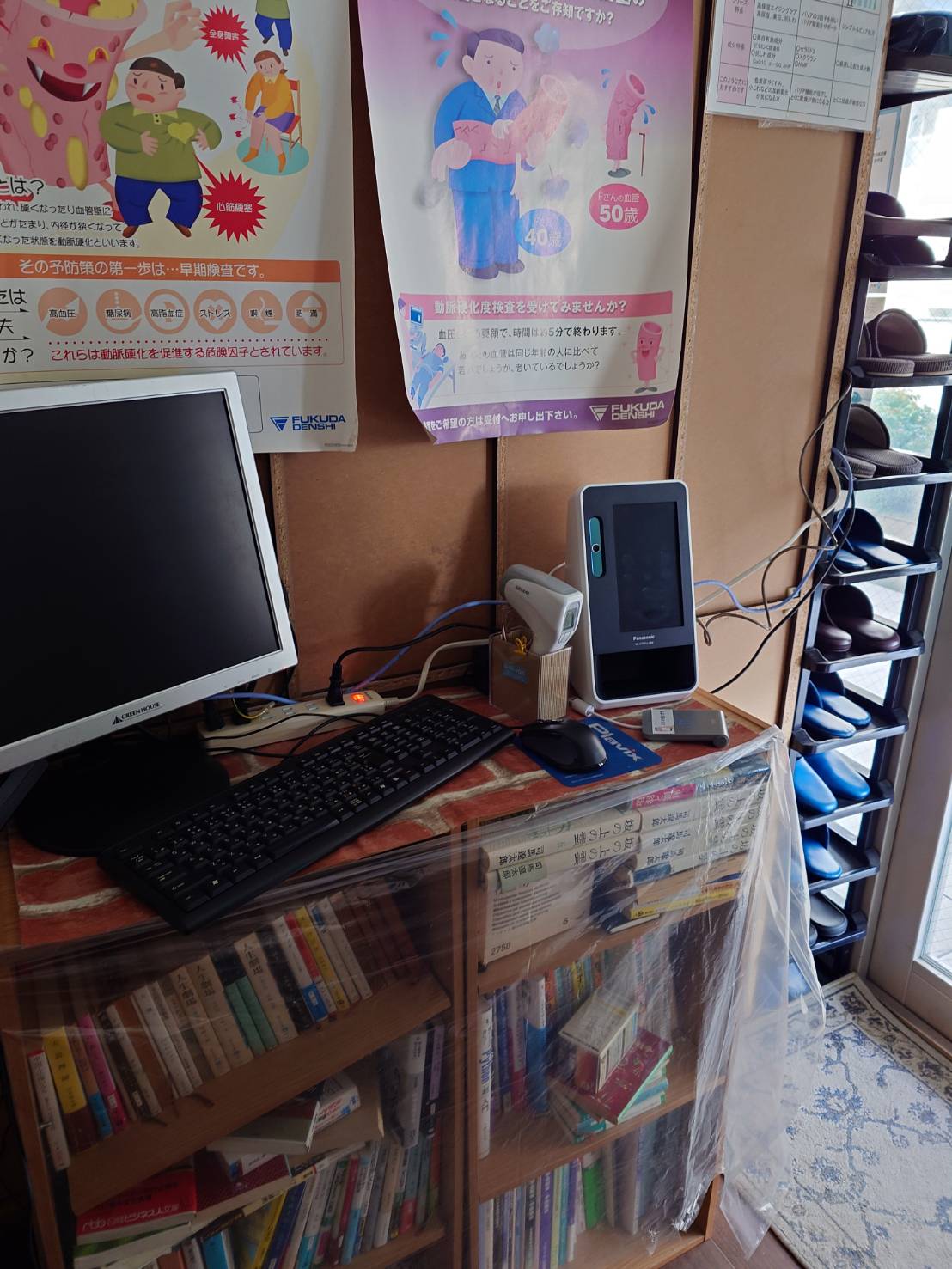 発熱外来にも顔認証システムを設置しております。まずはマイナンバーカードを機械に通してから横にあるパソコンから自動受付ボタンを押してください。